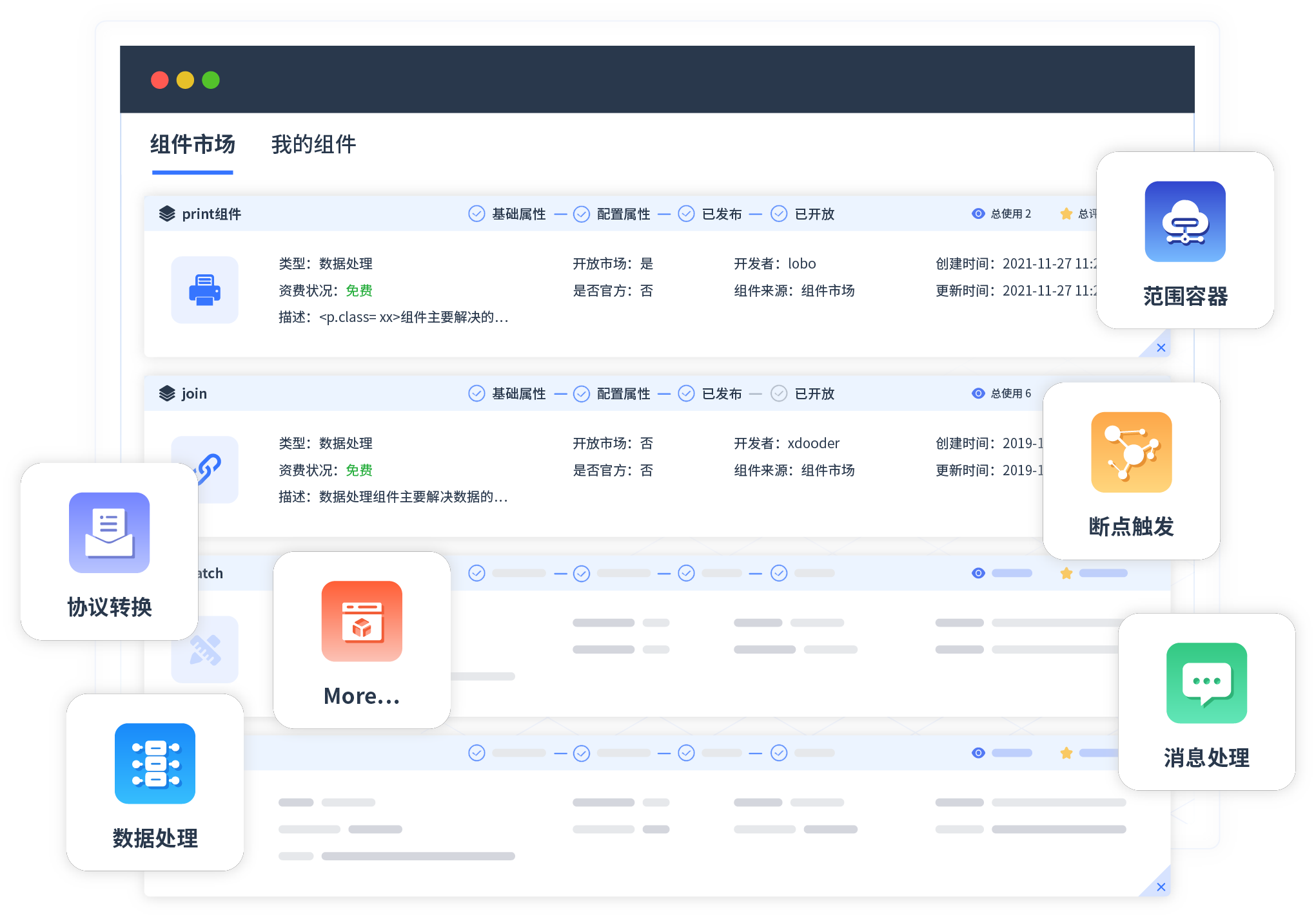 针对集成场景,,沃钱包提供组件市场,,,例如协议转换、、、消息处理、、、、文件操作等。。除平台提供的组件外,,客户可以自定义所需组件。。。