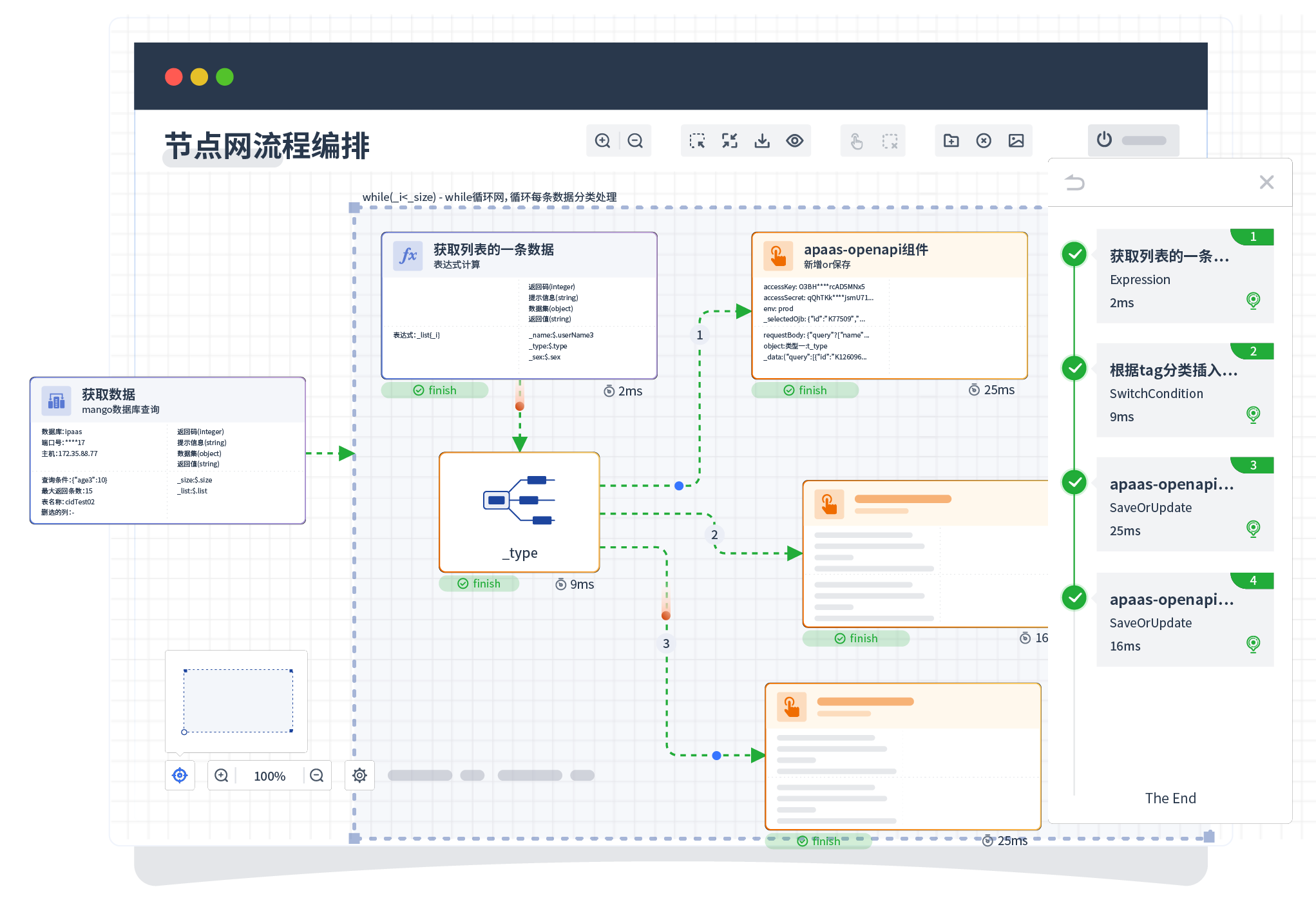 针对集成场景,,组件定义后支持进行流程编制,,不同于传统代码方式,,通过图形化展示,,支持在线调试、、、日志查看和运行回放。。。。